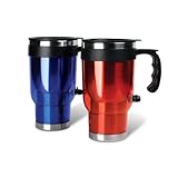 Keep your favourite beverage, soup and other liquids hot all day with this 2-piece Heated Auto Travel Mug Set by Meridian Point. Built-in heating leements keep the contents hot when plugged in to your automobiles DC Power Outlet Socket.Perfect for long trips or your morning commute, just plug in and go!Insulated stainless steel holds its temperature for up to 8 hours when unplugged.Lock-Top lip helps prevent spills and makes these mugs ideal for use anywhere.